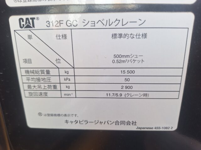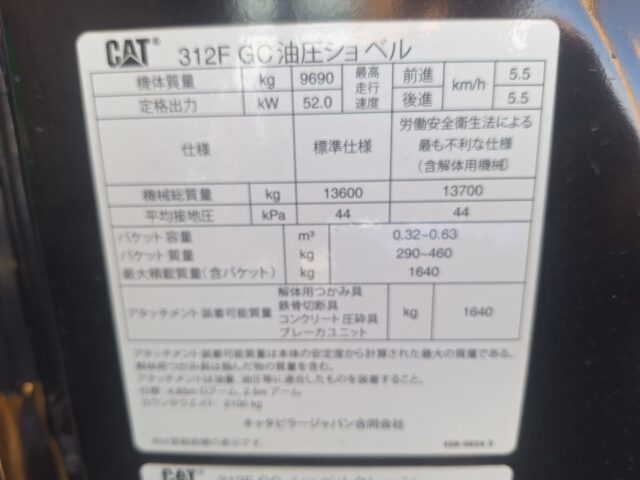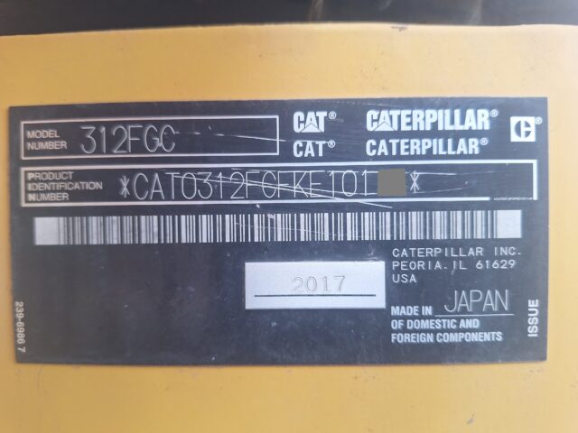 CAT 312FGC 2017年 1,275時間 2.9tクレーン仕様 500G ROPS-CAB EPA